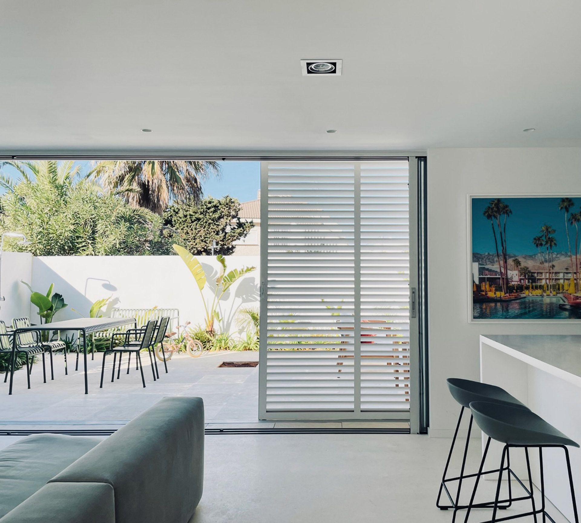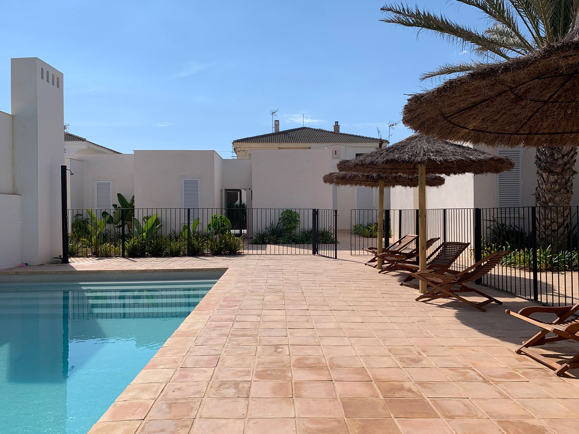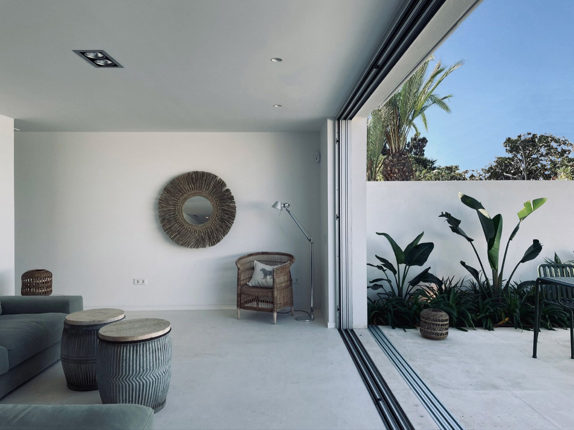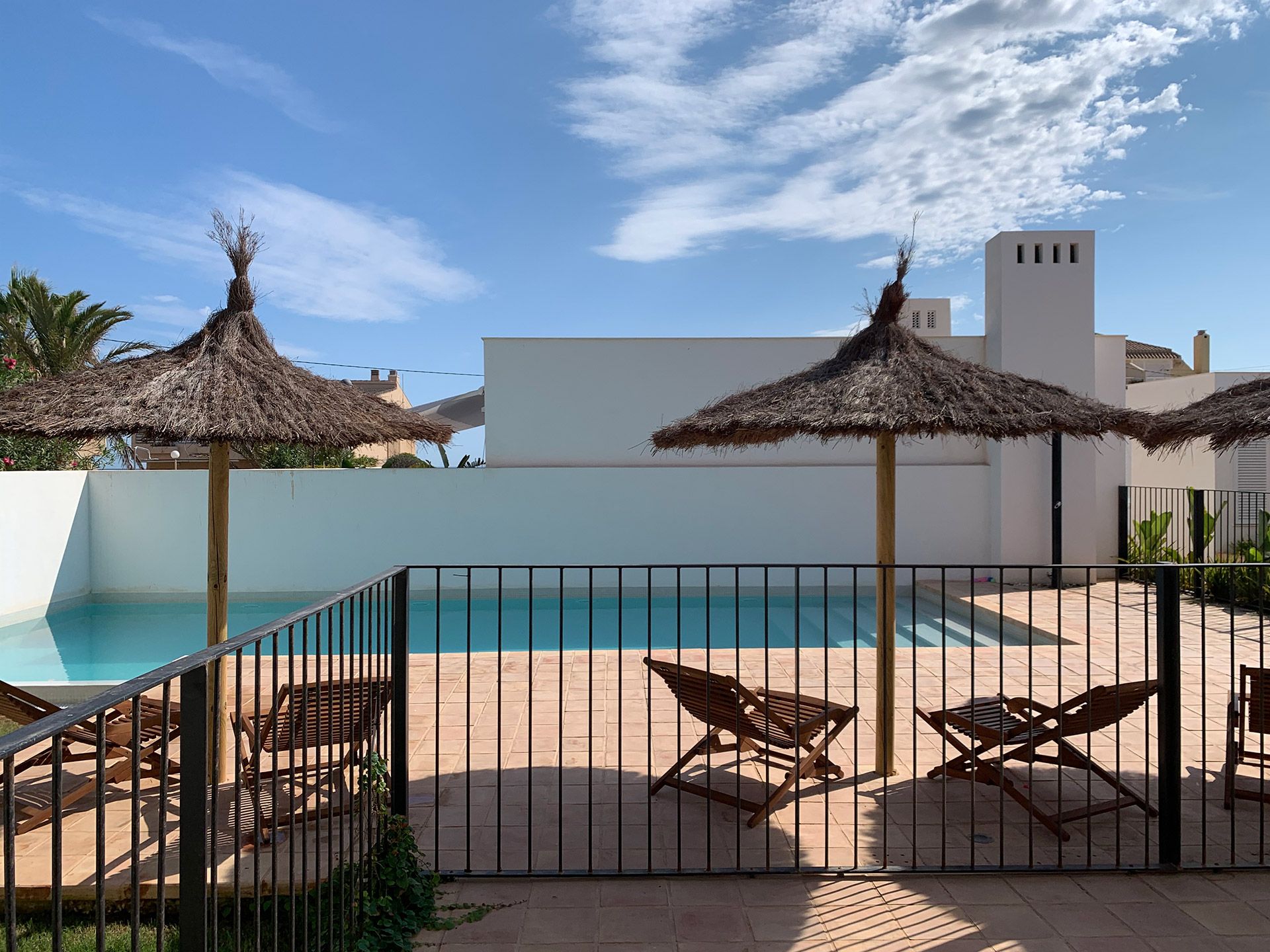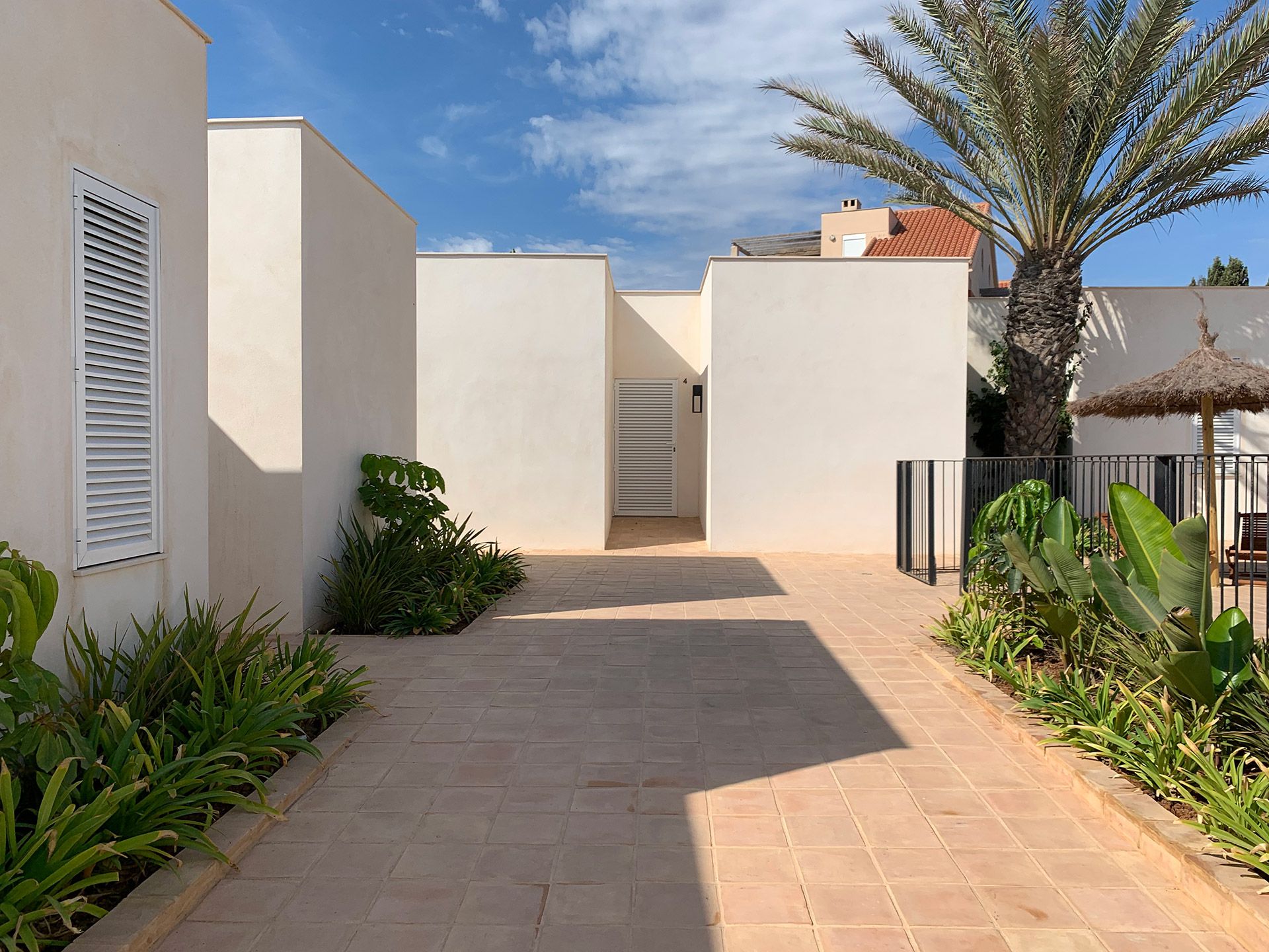 Los espacios comunes están delimitados por fachadas encaladas, con pequeñas ventanas siempre protegidas por mallorquinas, que permiten controlar la entrada de calor en la vivienda así como la privacidad en las zonas de noche. Las zonas de día ofrecen otra escala: se abren mediante un gran hueco a los patios, convirtiéndose en porches que se prolongan hacia el exterior.