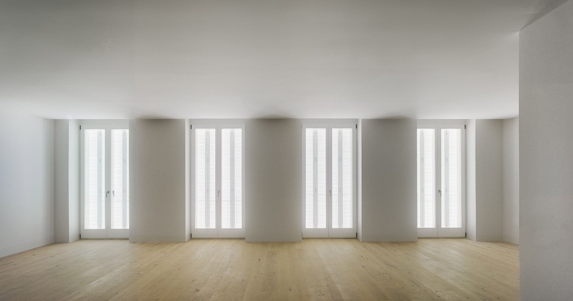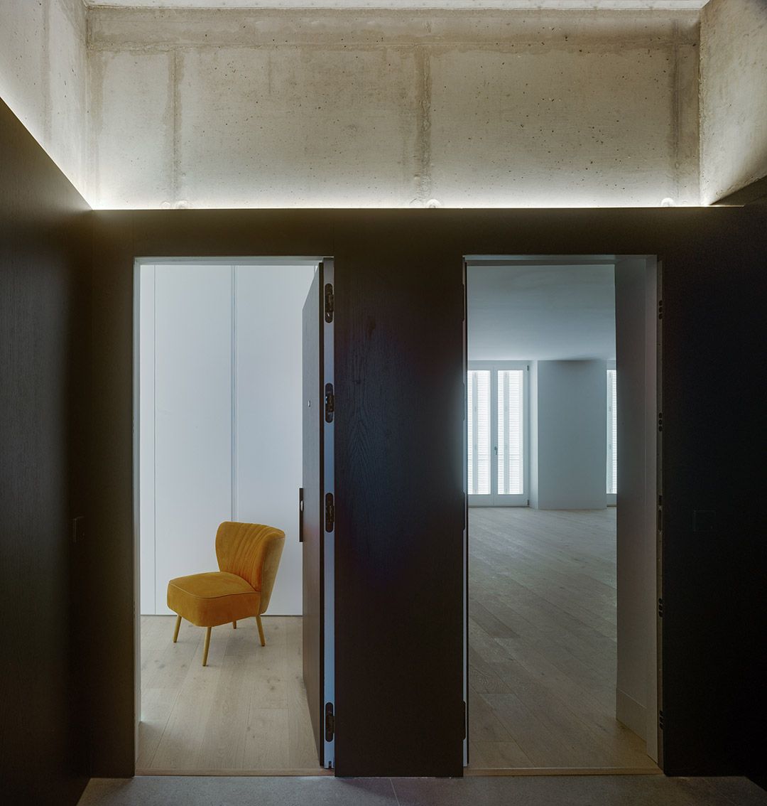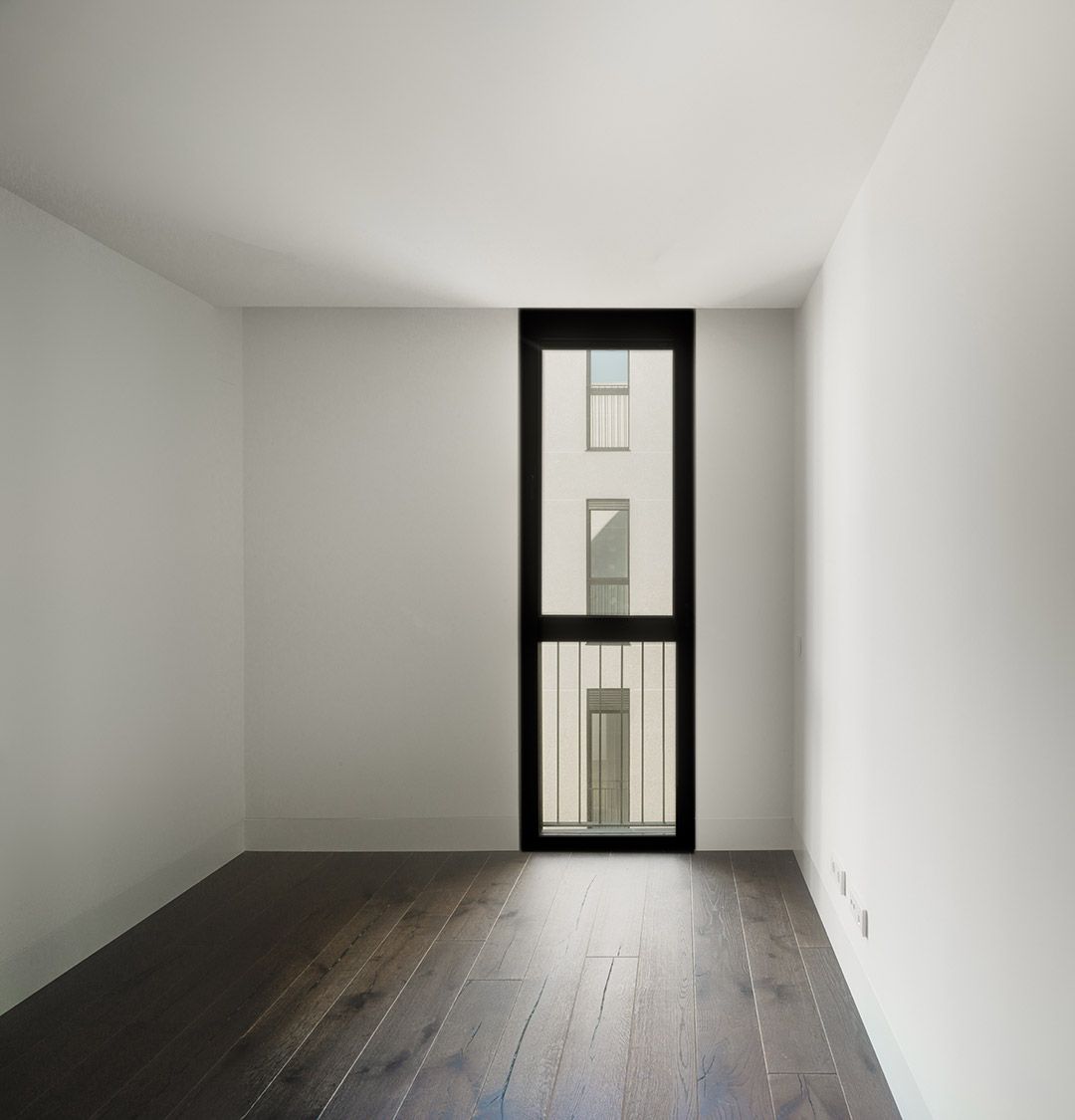 La dualidad de las dos fachadas, la restaurada y la contemporánea, se hace presente en los espacios interiores del edificio. Los espacios comunes nacen de la arquitectura contemporánea y se desarrollan en el edificio hasta llegar a las viviendas, cuyos interiores aúnan el aura más clásica de la fachada con la distribución y detalles más contemporáneos de las viviendas.