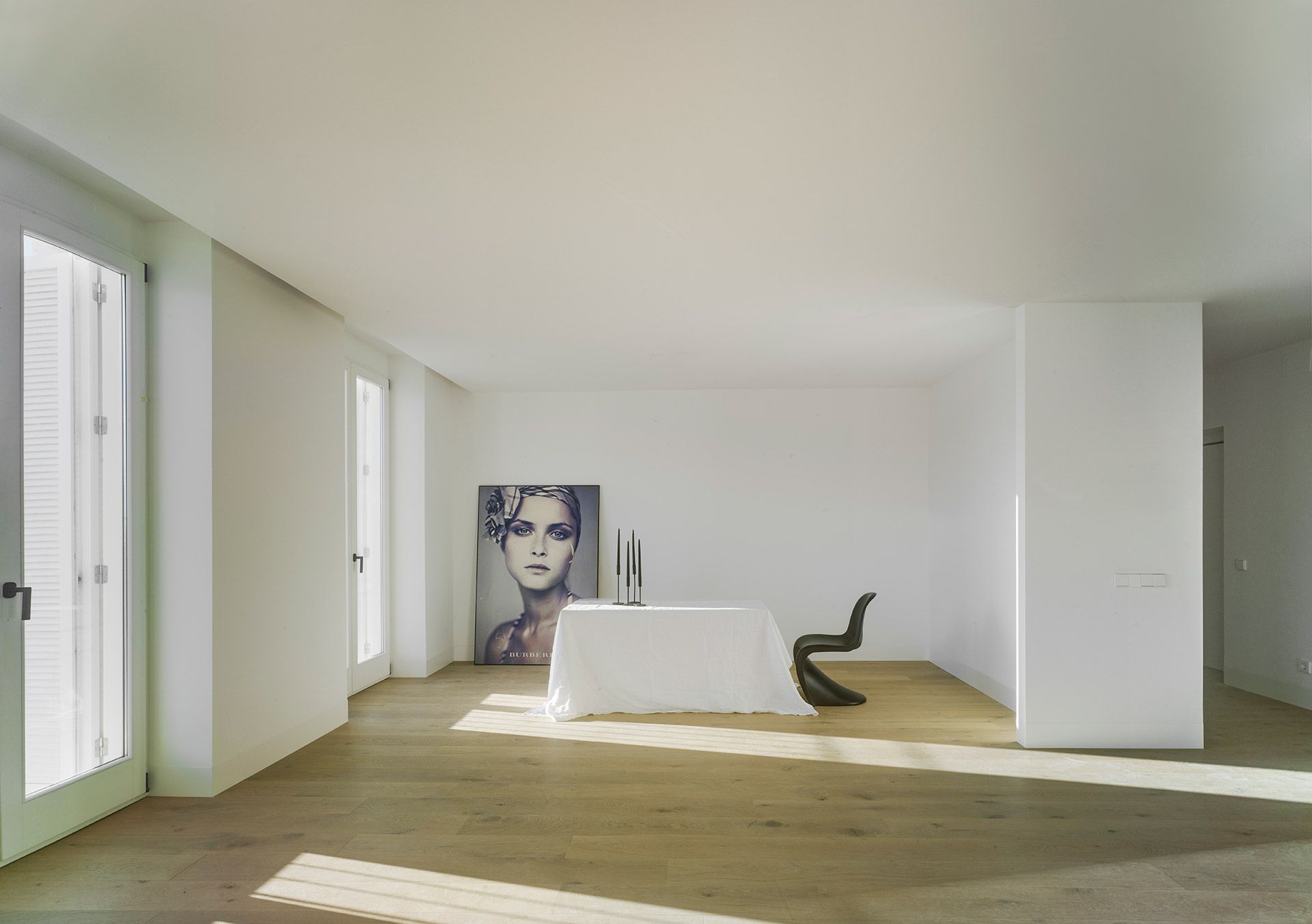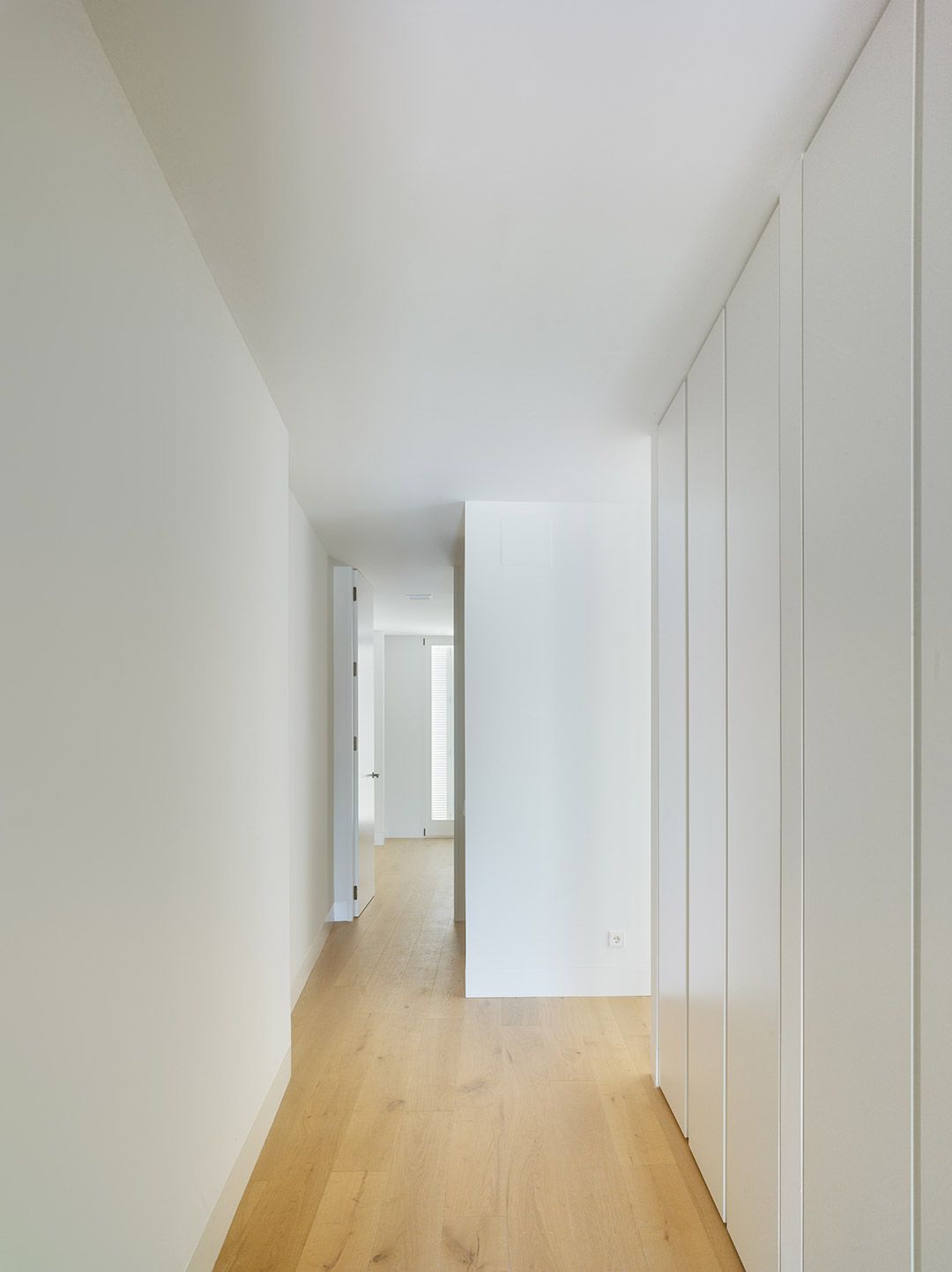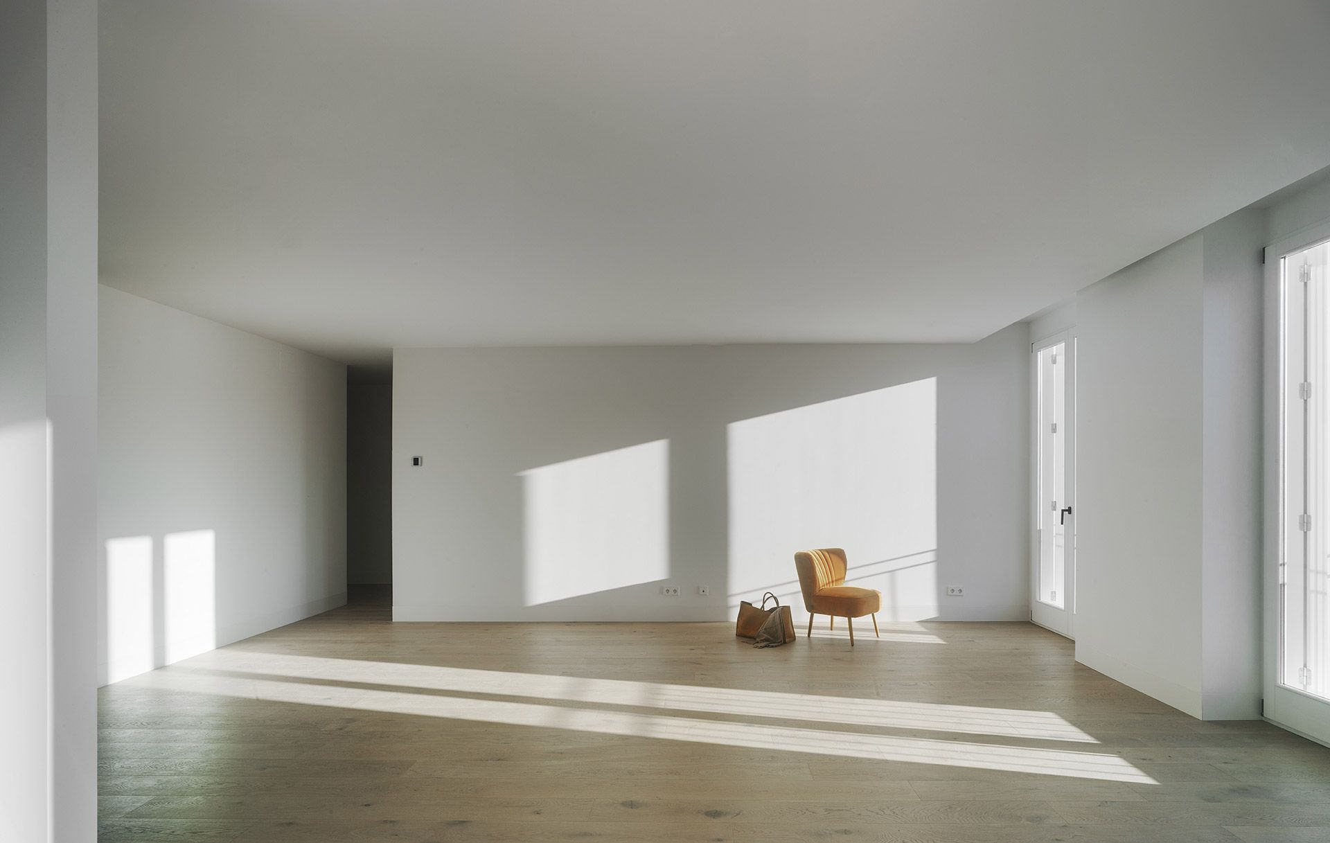 La dualidad de las dos fachadas, la restaurada y la contemporánea, se hace presente en los espacios interiores del edificio. Los espacios comunes nacen de la arquitectura contemporánea y se desarrollan en el edificio hasta llegar a las viviendas, cuyos interiores aúnan el aura más clásica de la fachada con la distribución y detalles más contemporáneos de las viviendas.