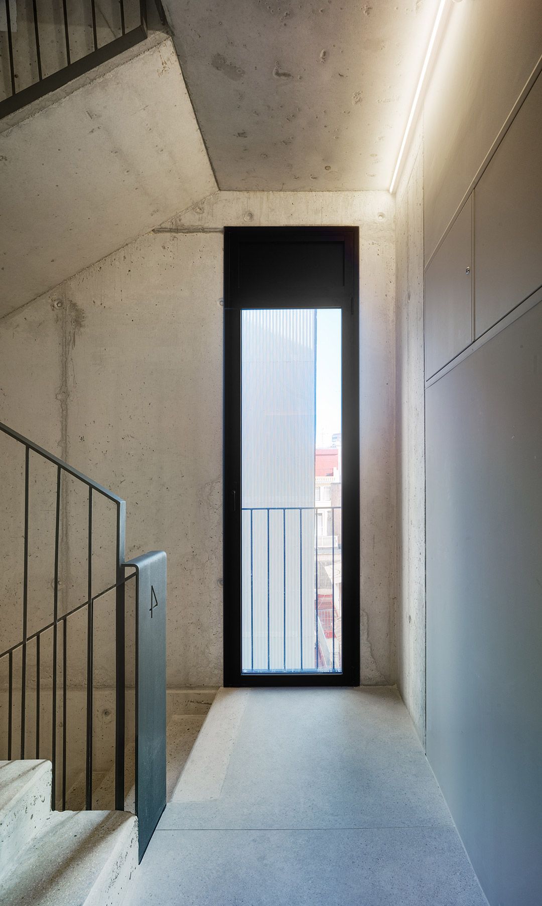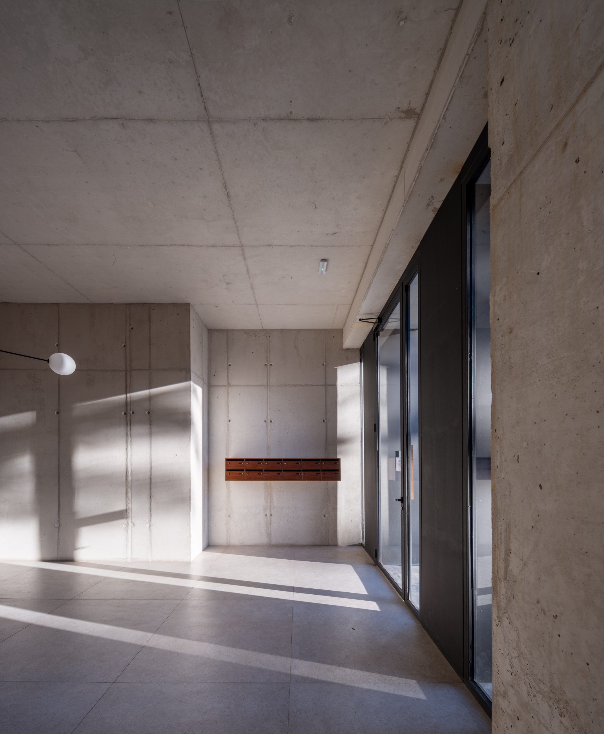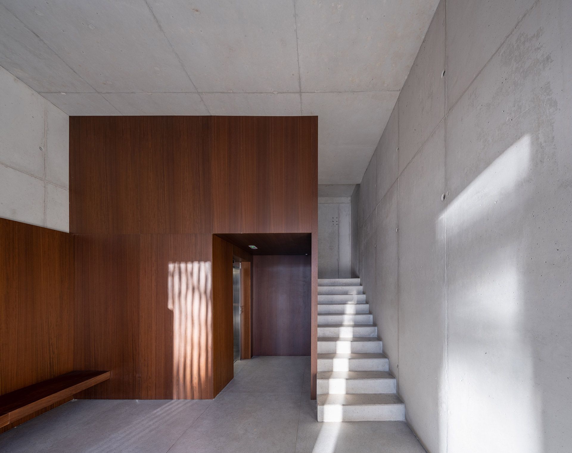 El hormigón estructural acompaña todos los espacios del edificio, desde la entrada, las escaleras, el rellano de las plantas, la fachada del patio, etc. Sobre el hormigón, la madera – material original de las ventanas y contraventanas del edificio- busca dar calidez a los espacios, estableciendo una relación entre la madera y el espacio habitado.