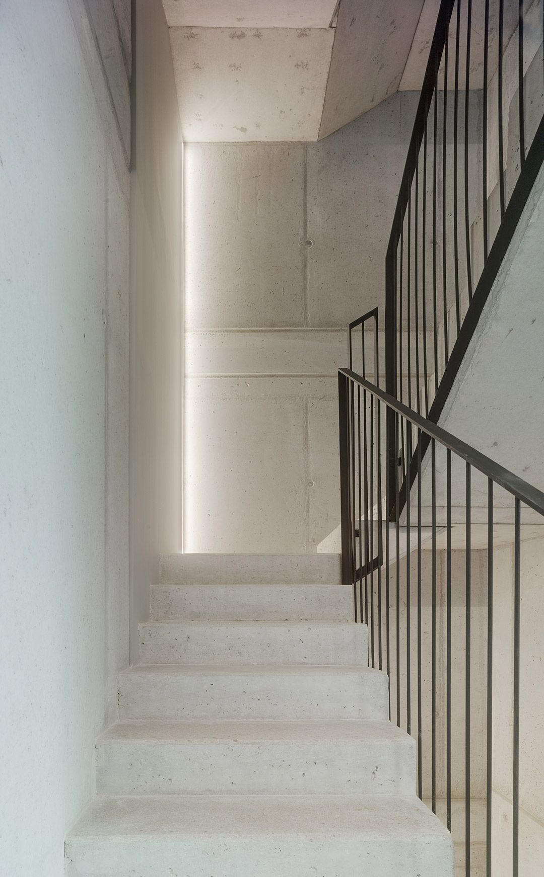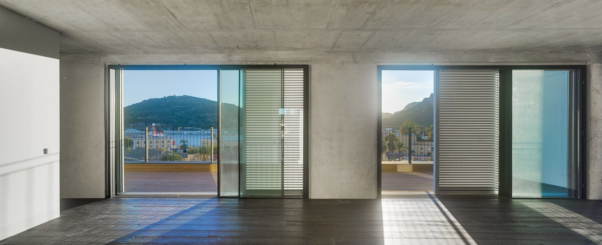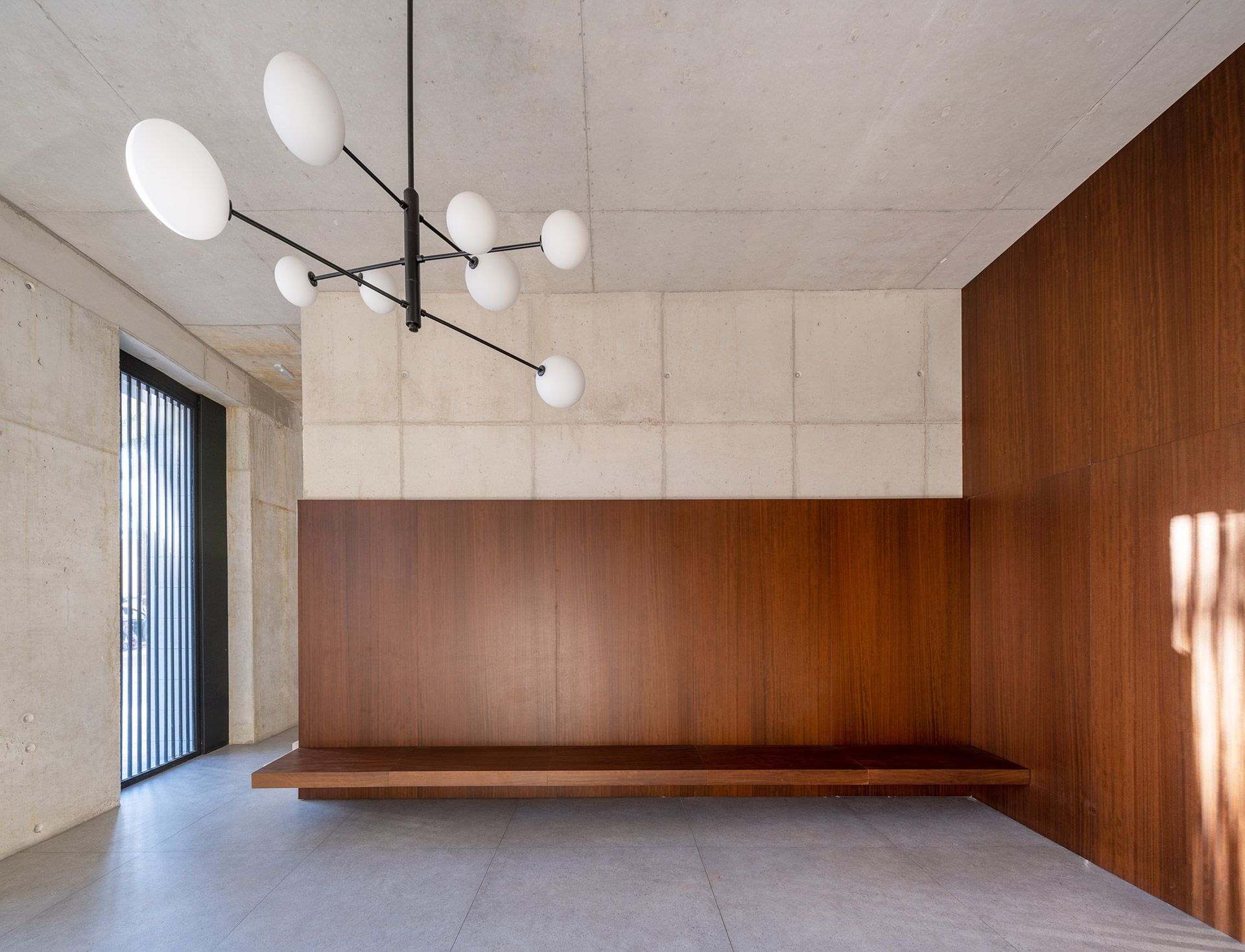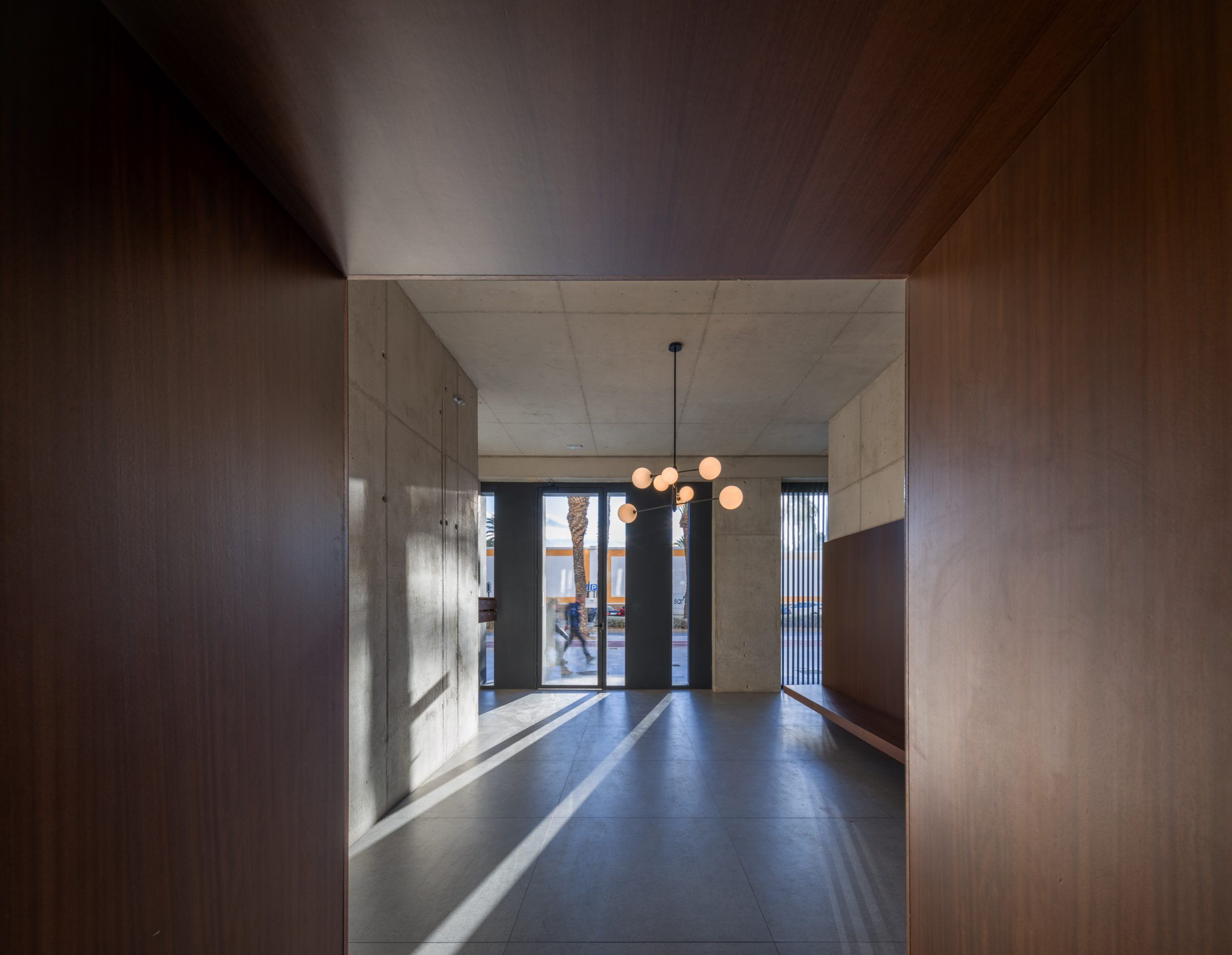 El hormigón estructural acompaña todos los espacios del edificio, desde la entrada, las escaleras, el rellano de las plantas, la fachada del patio, etc. Sobre el hormigón, la madera – material original de las ventanas y contraventanas del edificio- busca dar calidez a los espacios, estableciendo una relación entre la madera y el espacio habitado.