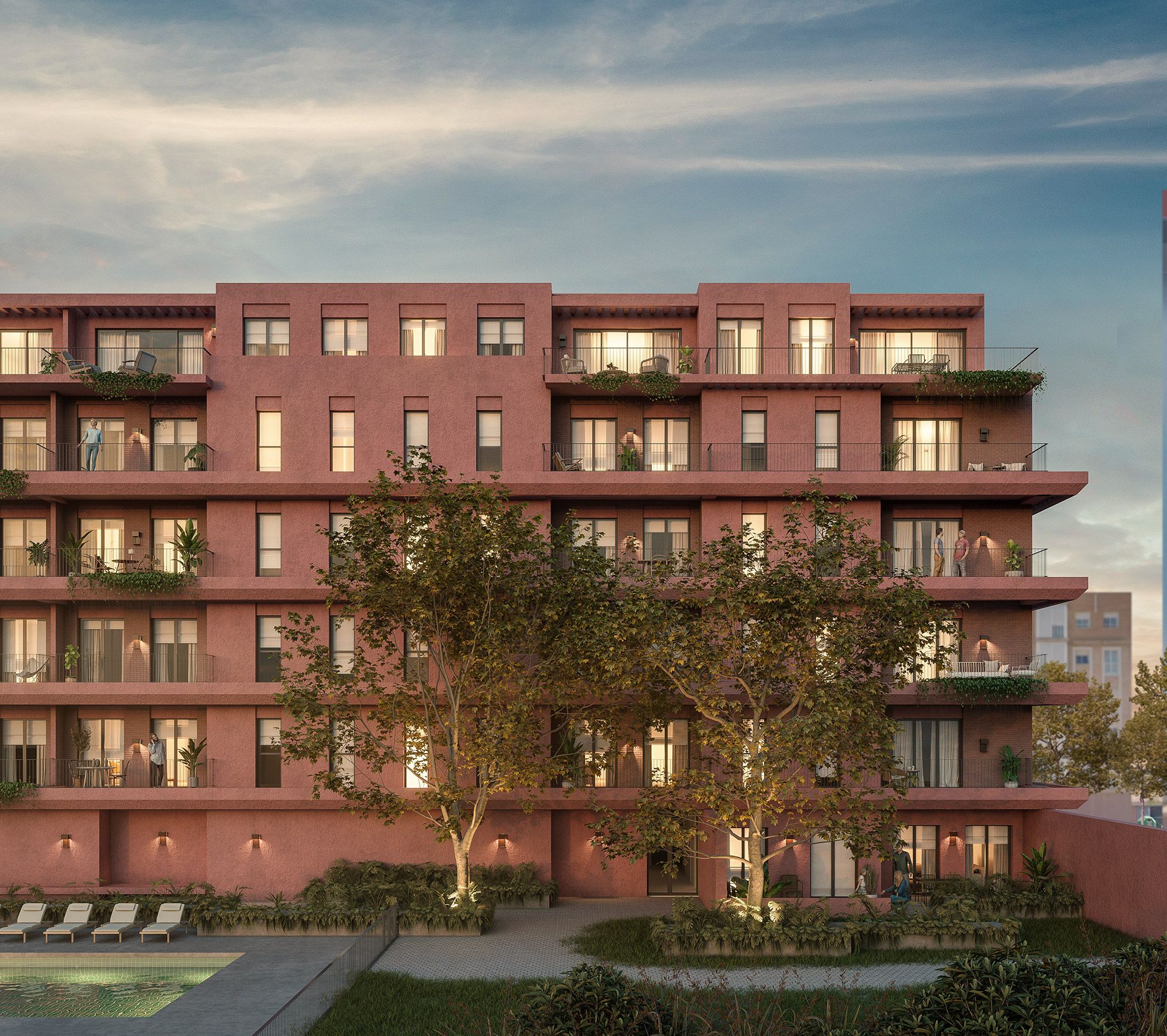 Espacios abiertos a las zonas comunes, con volúmenes fragmentados para reducir la gran escala del edificio y poder ofrecer una arquitectura más personal, en la que los habitantes se pueden apropiar más fácilmente del espacio. La sencillez de las líneas busca transmitir calma en un proyecto que se inspira en los colores de la tierra, en las montañas de la sierra minera. Paisajismo naturalista en zonas comunes, buscando crear un habitat adecuado al clima local, que permita un desarrollo de la vegetación de manera natural y sostenible.